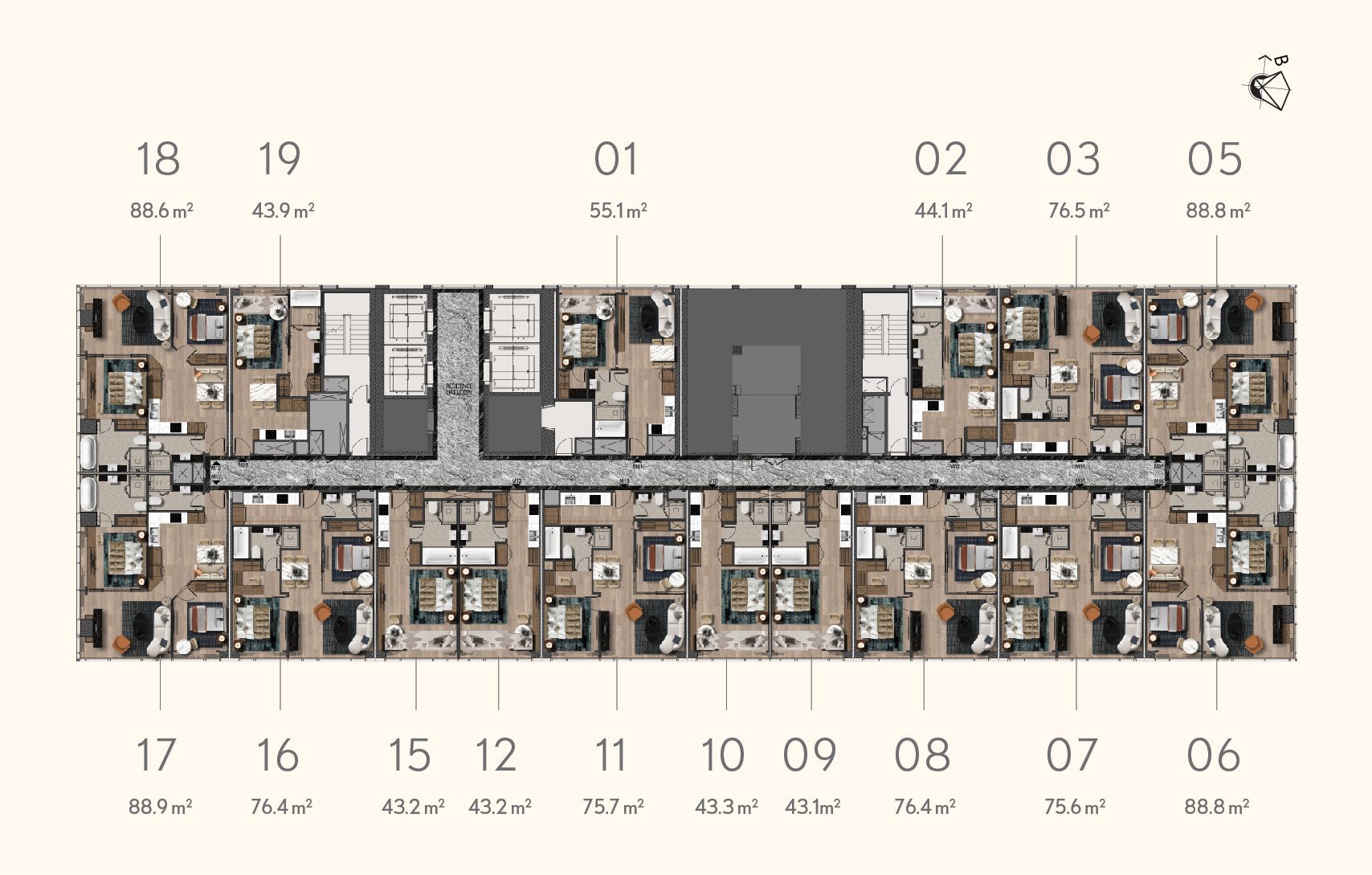 Mặt bằng tầng điển hình của dự án được bố trí thông minh, tối ưu hóa diện tích sử dụng và đảm bảo tính riêng tư cho từng căn hộ. Mỗi tầng đều tích hợp hành lang rộng rãi, hệ thống thang máy hiện đại và hành lang thoáng đãng, tạo nên sự tiện nghi và thoải mái trong từng khoảnh khắc sống.