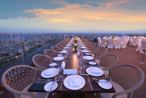 Không gian trên tầng cao nhất khách sạn giống như một sân khấu mở – nơi mỗi cuộc gặp gỡ đều trở thành khoảnh khắc thăng hoa trong khung cảnh ngập tràn cảm xúc.